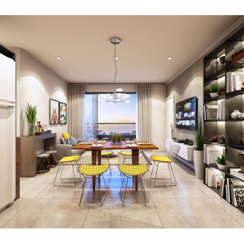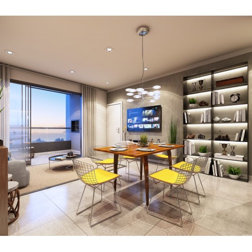serviço, área social em plano aberto e integrando sala de estar/jantar, cozinha e